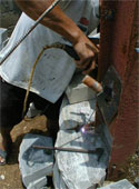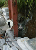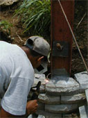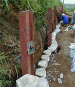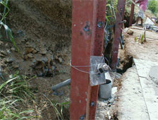 Next, scrap I-beams with perforations were erected after being properly plumbed with the threaded head of the soil nails protruding through the I- beam. The soil nail was then ‘locked’ into the I-beam with a nut.