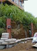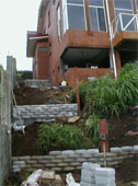 The first objective was to create a terraced area of approximately 17 meters by 1 meters on one level and 2 meters on the upper level on a property where a back yard was hardly existent because of it’s extreme and sudden slope.