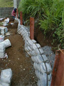 Backfilling of areas behind LocBlocs with waste sand or gravel (‘gravitas’), close-up of ‘built – in’ weep holes of the LocBloc (gaps formed by the irregular contours of the LocBloc face ).