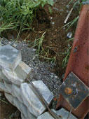Soil Nail seen inserted through I Beam Post, First course of LocBlocs laid on CHB course laid in front of I-Beam